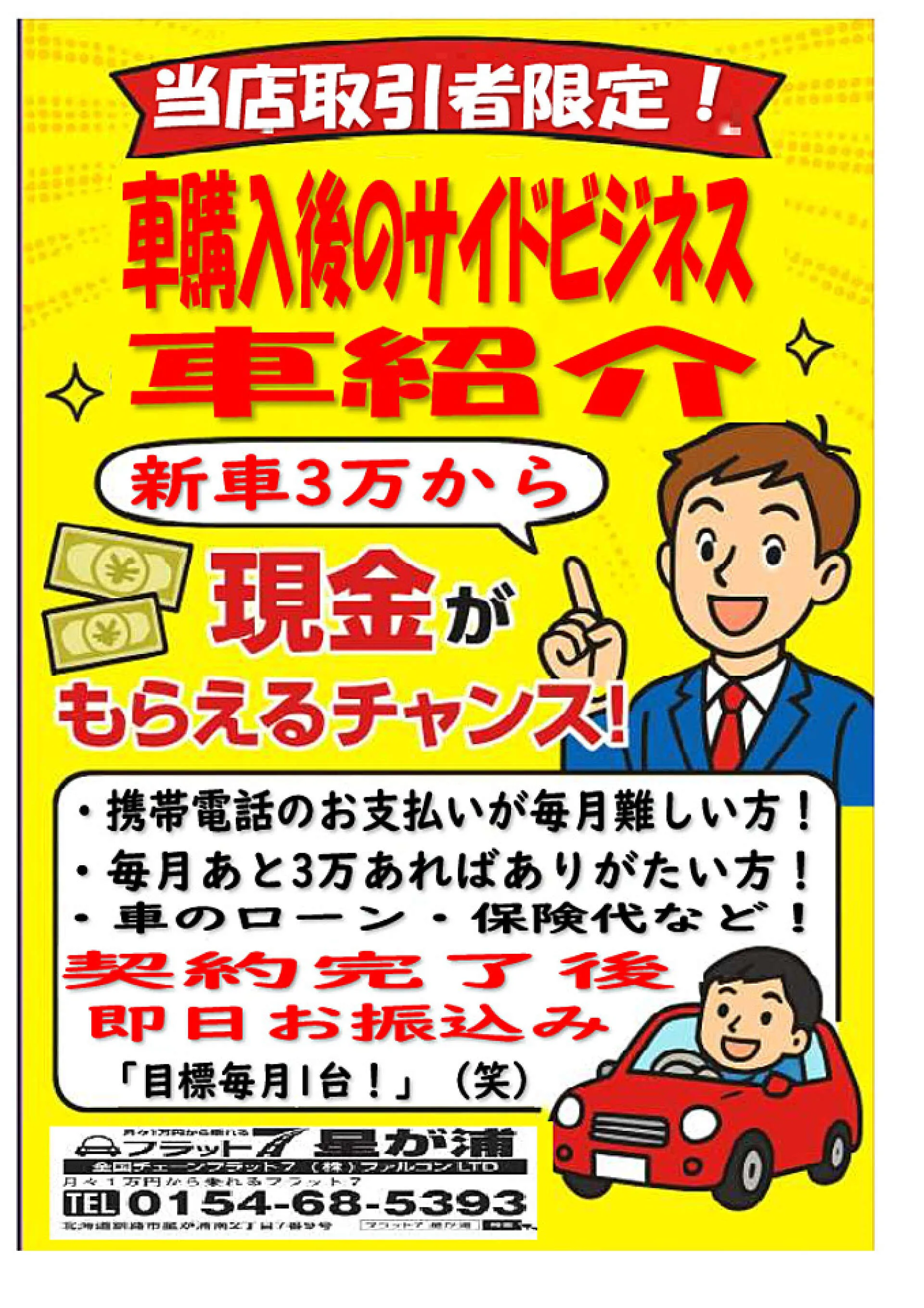 明るい黄色の背景に、スーツ姿の男性が親しみやすく微笑んでいるこのイラスト。まさに「ちょっと気になる話があるんです」と声をかけてきそうな雰囲気ですよね。車を購入した後も、実はこんな風に新しい可能性が広がっていること、ご存じでしたか?日々の生活費やローン支払いなど、「あと少し余裕があれば…」と感じる瞬間は誰にでもあります。